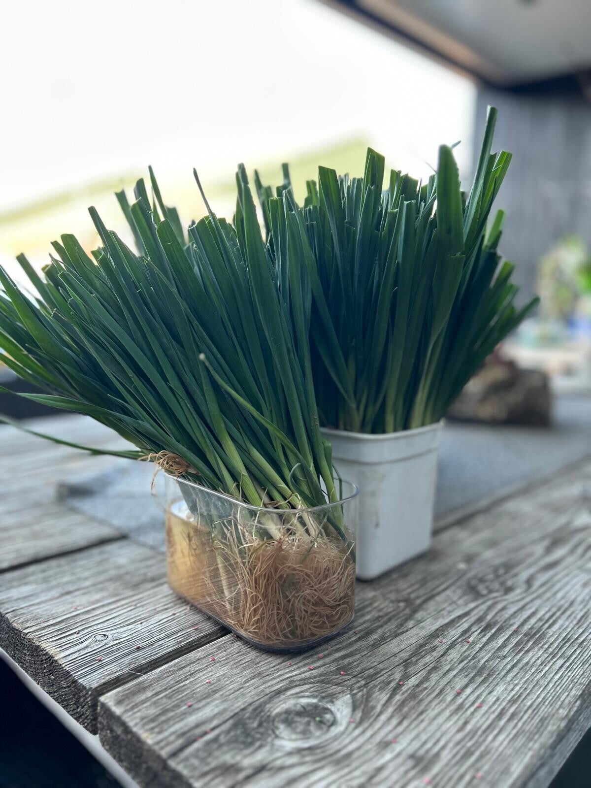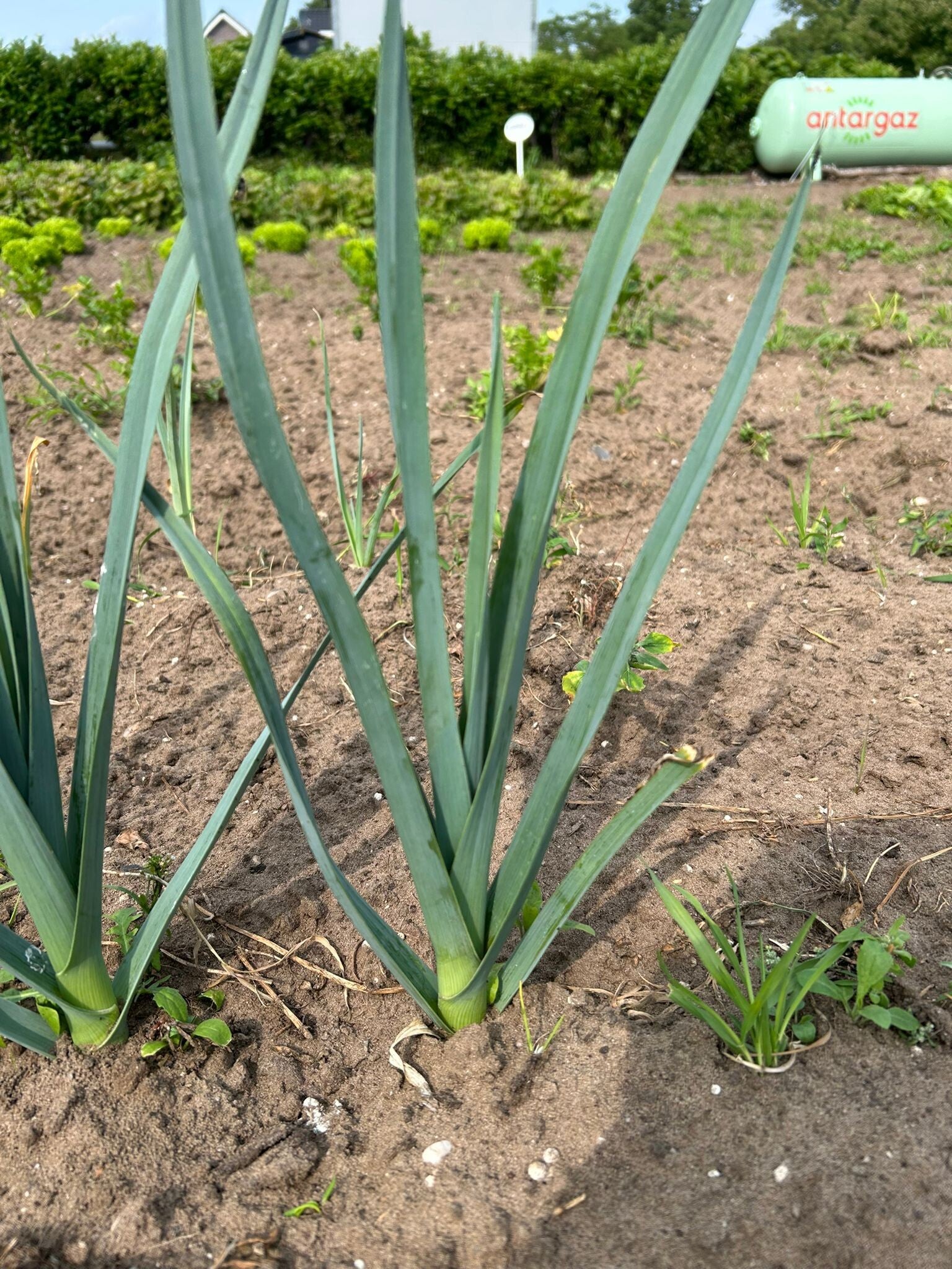 Hier zie je de eerste prei die klaar is voor de oogst. Tijdens het planten hebben we de prei voor 3/4 bedekt met zand, waardoor je nu bij de oogst een mooie witte stengel zult krijgen.